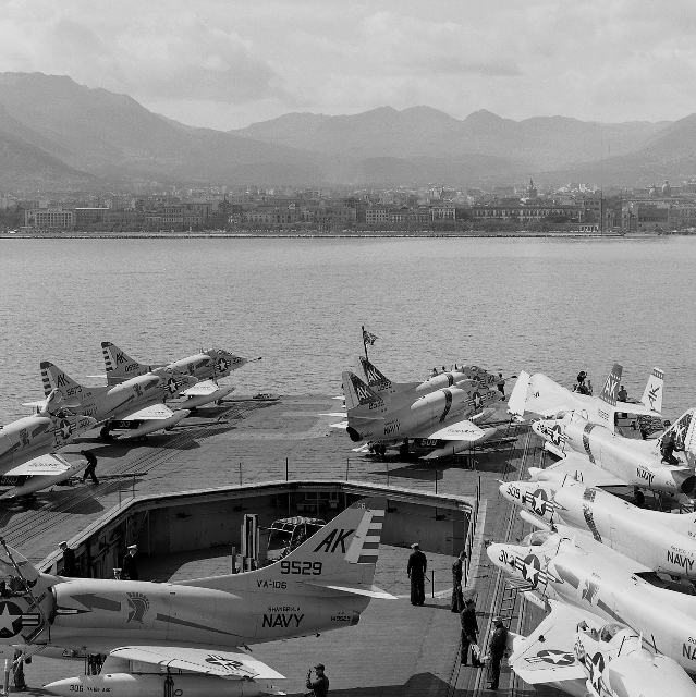 We can all remember being at anchor in a bay of a new and exotic port, where adventures awaited. Remembering the ship's crane hoisting liberty boats into the bay. . . and later with much anticipation, arriving ashore and being assaulted with calls of "Hey Joe, I have a sister. . ." or, "You want to buy a Zippo?" Or taking advantage of "Join the Navy and See the World Travel Agency" to see the cultural places that have drawn many of us back, as Larry did in Paris. I remember while at anchor, the locals inquisitive about this larger-than-can-be-believed carrier and sometimes being allowed to visit the flightdeck---People-to-People Diplomacy. I remember in some ports throwing tarps over the RF-8 camera bay windows to disguise the real purpose behind its mission. Even if one didn't go ashore, sometimes USO shows would come to the carrier with real celebrities honoring servicemen, or just walking the flightdeck to view the Mediterranean shore, smelling the sea and distant land. Often just carrying a portable radio around listening to the foreign music was fun. And, at night from ashore looking at the carrier all decked out in lights---what a sight---followed by the bouncy, sometimes scaring ride back, often holding onto a shipmate heaving over the side---and finally, with relief, climbing the ladder, sometimes not too steadily. Ah, that was so long ago. . . Larry's photos, so professionally shot, helps bring it all back. Thank you Larry.