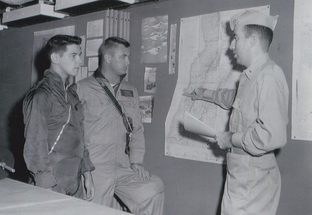 Cdr. English (CAG) congratulating Det pilots & PI on return to stateside: Dennis Looney is on cag's right. Ward Berkey is shaking his hand. Rich Maioriello behind Berkey and Eugene Bezore.); Next two photos: Dennis Looney briefing Lebanon mission to Ward Berkey(2nd from left) and Rich Maioriello (right)