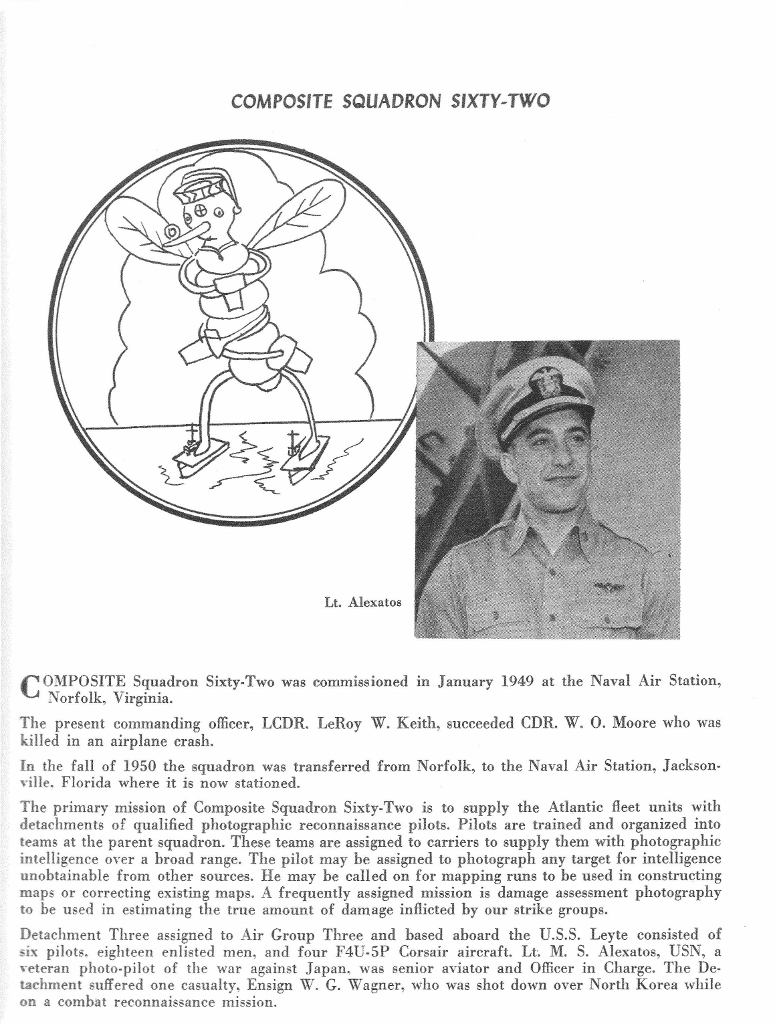 VC-62's detachment, with its F4U-5P photo-Corsairs, joined Task Force 77 aboard the USS Leyte (CV-32) September 6, 1950. Leyte arrived in Sasbo, Japan October 8, 1950 and supported Korean War operations October 9, 1950 to January 19, 1951. The carrier and airgroup spent 92 days at sea and flew 3,933 sorties against North Korea. The airgroup pilots accumulated 11,000 hours in the air. Leyte returned to Norfolk, Virginia February 25, 1951.