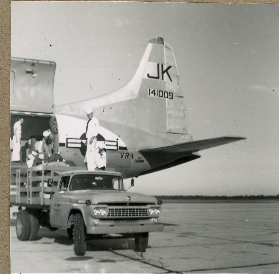 Photo taken in mid-1960 as our VFP-62 Det.33 was arriving at NAS Norva from NAS Cecil Field, FL.: Unloading Det gear at Norfolk-We were taking our three F8U-1P Crusaders aboard USS Intrepid CVA-11 for carquals, first Crusader unit to operate aboard the Mighty I. Never could figure out why, when we traveled by military cargo, that we had to have our dress uniforms on and then be expected to load/offload our gear - at the aircraft and then at the ship! -J.J. McKenna
