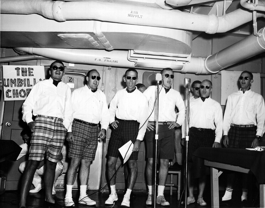 "We were just a group of guys with VFP 62 including Frank Liberato, Newby and me leading the group. We did not call ourselves a chorus, but used to sing or perform at Air Wing parties and special events in the Wardroom."---Jim Curry