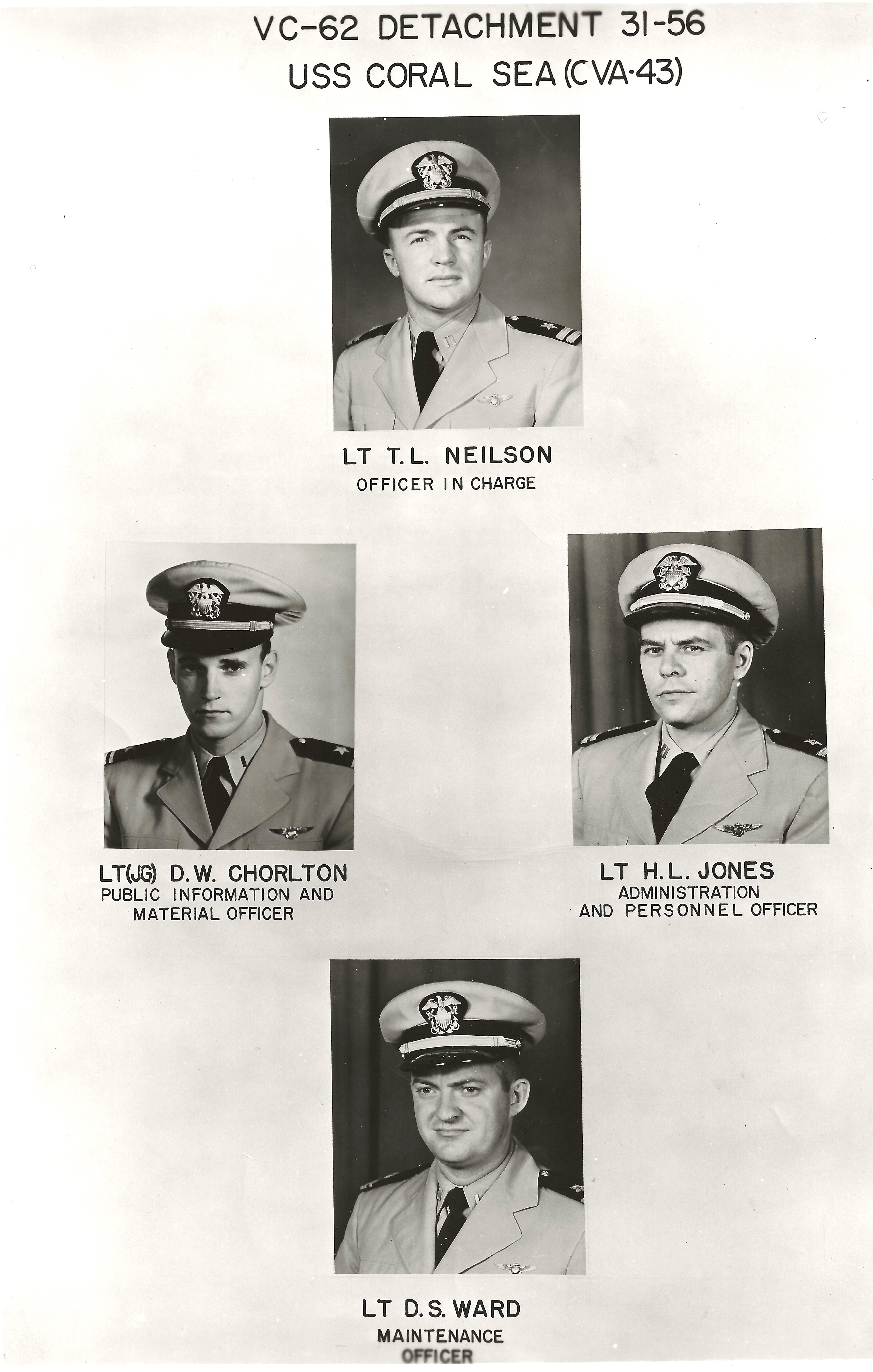 Webmaster's Note: VFP-62 was a large squadron that supplied detachments (Dets) to the fleet carriers. These detachments usually had 30-40 crew members with 2-3 planes. The senior officer was the Officer in Charge (OinC), three-to-four pilots, one photo intelligence officer and senior petty officers would be the leaders of the 35-40 enlisted maintenance and support crew.