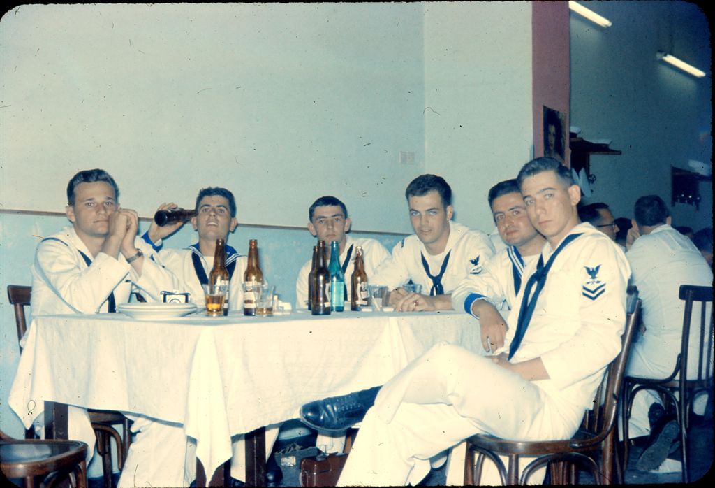 Taranto Bar Det 65 '62 R.L. Loudon AMS3, Italian Sailor, Jim Weaver AMH2, Rich Young AT2, Italian Sailor, Jim Trenoskie AME2. Photo: Jim Trenoskie |