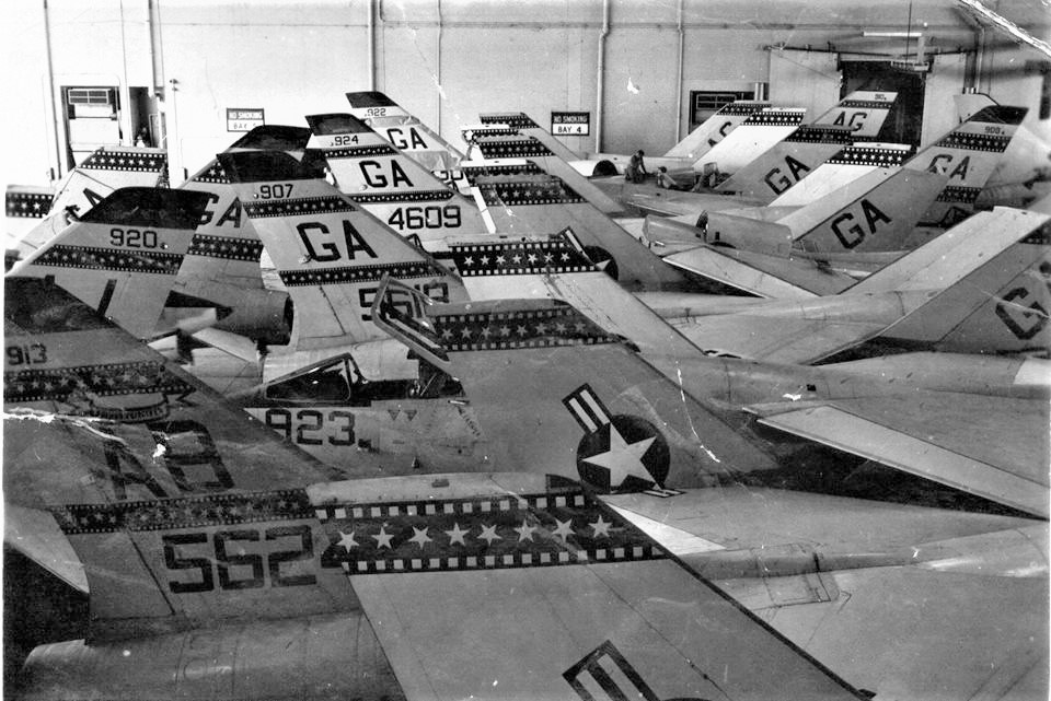 "Shark" frenze: VFP-62 Crusaders being sheltered from a hurricane. The densest parking you'll ever see. Photo: Bruce Nason